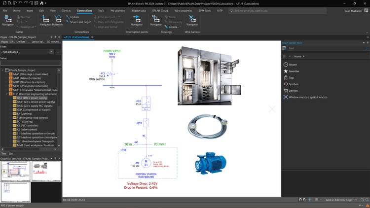 From version 2024 onwards, project-specific calculations can be carried out directly in the software, which saves users a lot of time, especially for short-term changes. For example, the voltage drop on a cable between a motor control center and the pump to be supplied can be calculated and verified directly in the circuit diagram thus making sure the cable size is ok for the correct functioning of the pump without detours via Excel.