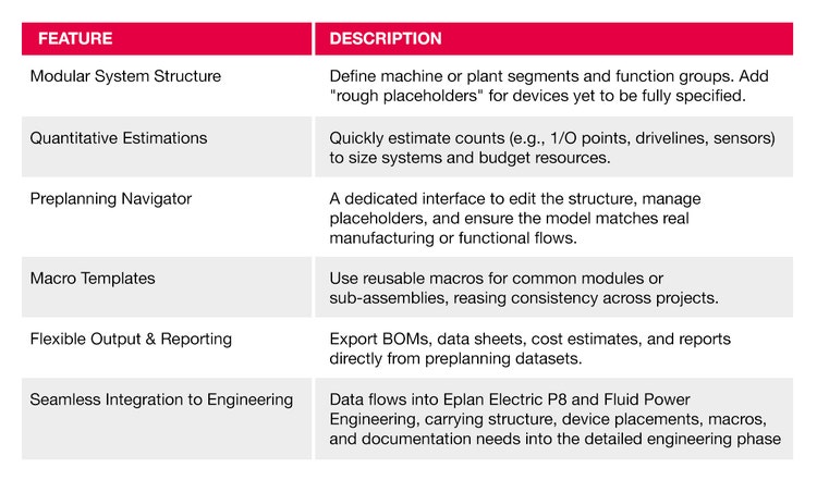 Eplan Preplanning isn’t just a data entry tool. It’s a feature-rich environment designed to bridge the gap between concept and detailed engineering. Each capability within the platform plays a critical role in organizing requirements, visualizing system structures, and ensuring seamless integration downstream. The following table highlights key features and explains how they empower applications engineers to work smarter, reduce errors, and accelerate project timelines.