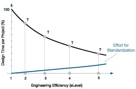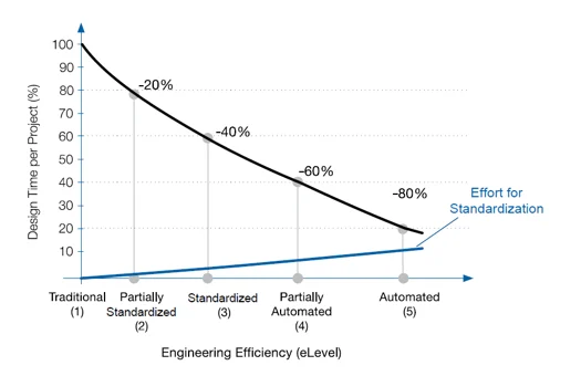 A higher degree of automation can reduce the method value, meaning the effort necessary for creating a schematic page. In turn, the effort for standardization increases with a higher degree of automation. Design time and effort for standardization depends on the engineering method.
